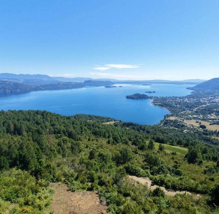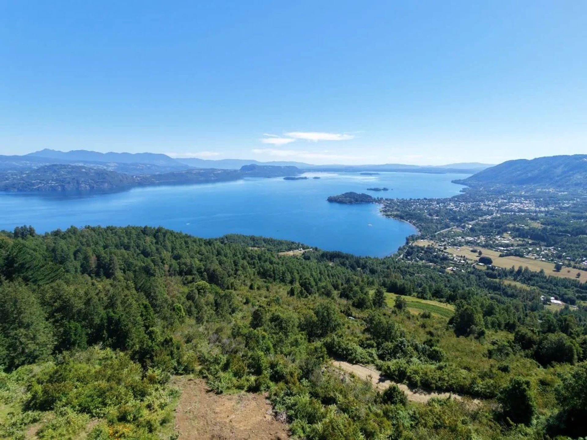 Vistas panorámicas al lago y entorno natural de Licán Ray desde el aire.