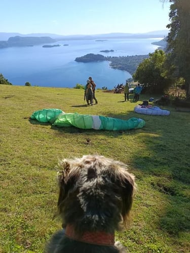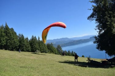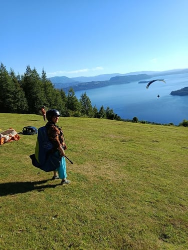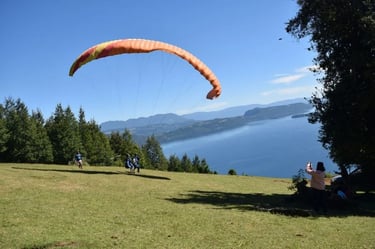La experiencia de parapente en el Cerro Challupen comienza con una preparación guiada en una ladera amplia y natural, donde el equipo se organiza y el piloto orienta y explica para el despegue. El proceso es tranquilo y progresivo, permitiendo sentirse seguro y confiado antes de iniciar el vuelo.